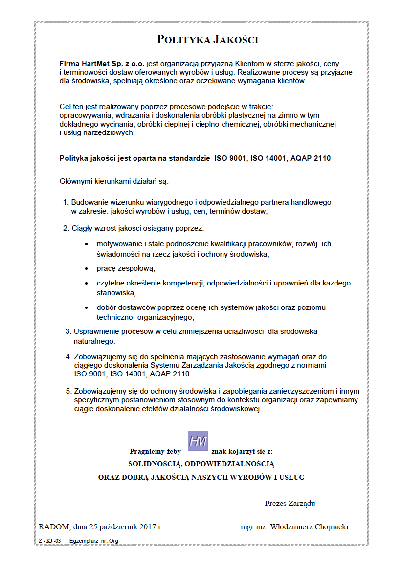 Naszą specjalizacją jest obróbka plastyczna na zimno (tłocznia), usługi z zakresu obróbki cieplnej i cieplno-chemicznej (hartownia) oraz obróbka mechaniczna i usługi narzędziowe (narzędziownia).